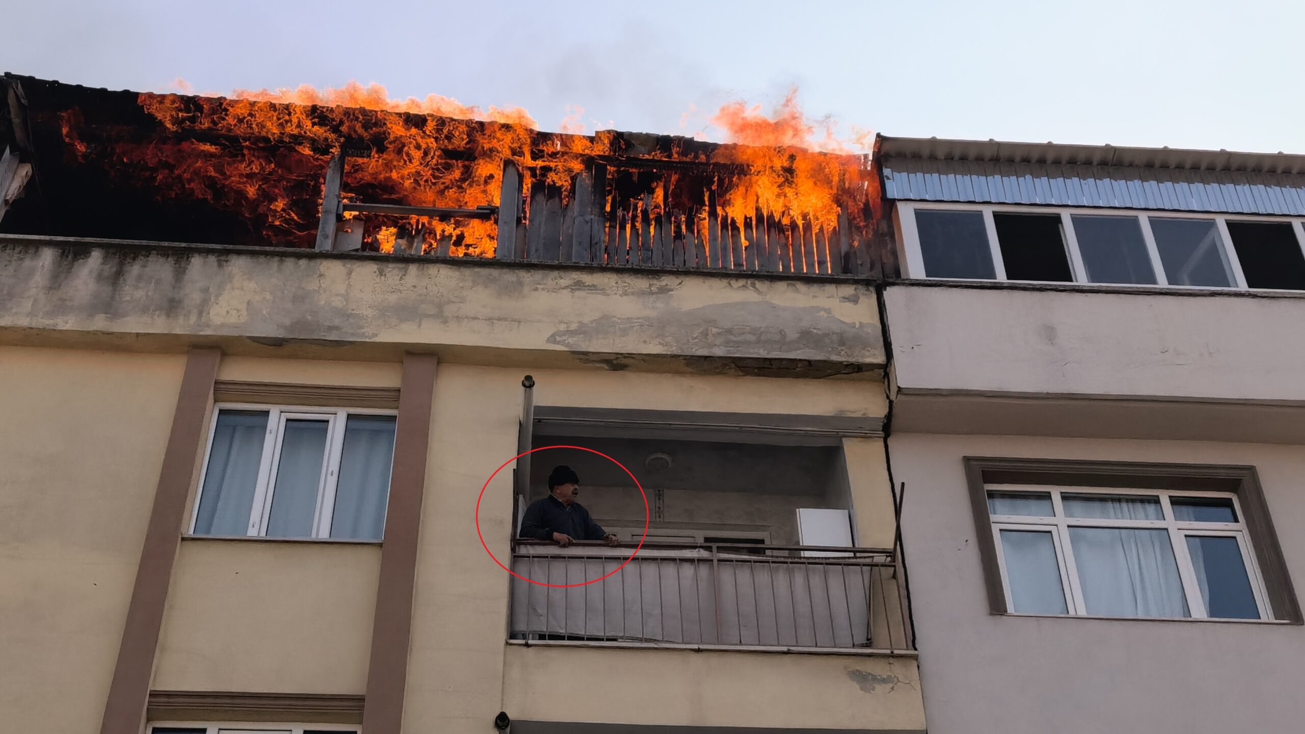 Bursa'nın İnegöl ilçesinde 4 katlı binanın teras katında çıkan yangın itfaiye tarafından söndürülürken, bitişik binada olup, elinde kova ile pencereye çıkan kadın yardım istedi.