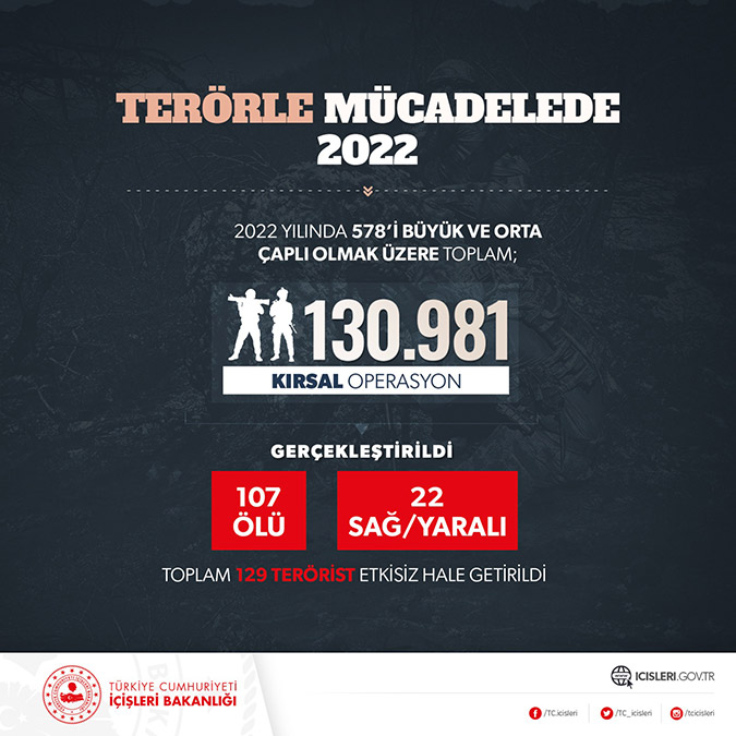 Bakan Soylu, Twitter hesabından yaptığı açıklamada terörle mücadelede 2022 yılının verilerini paylaşarak, “Terörle mücadelemiz aman vermeden, temizleye temizleye devam. Allah’ın izniyle Cumhuriyetimizin 100’üncü yılında, sınırlarımız içerisinde dağlarda bir tek terörist kalmayacak” dedi.