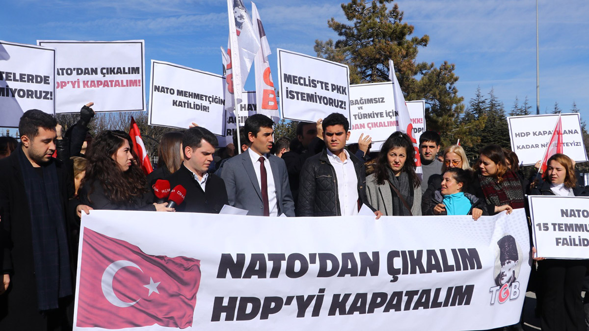 Türkiye Gençlik Birliği (TGB) ve Türkiye Liseliler Birliği (TLB) üyesi 80’e yakın kişi, HDP’nin kapatılması davasının sürdüğü AYM önünde bir araya geldi. Ellerinde ‘HDP’yi kapatan mahkeme kararını Türkiye alkışlar’, ‘NATO’dan çıkalım HDP’yi kapatalım’, ‘Meclis’te PKK istemiyoruz’ yazılı dövizler taşıyan grup, ‘NATO’dan çıkılsın, HDP kapatılsın’ sloganları attı.