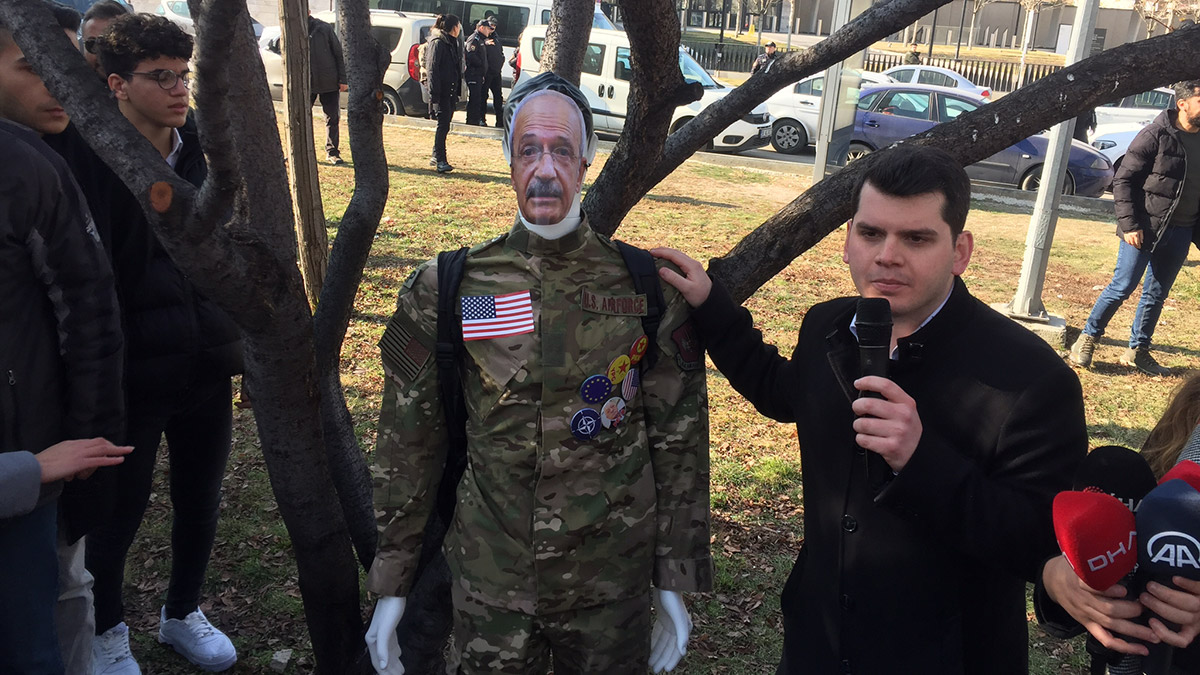 Grup, daha sonra cansız mankenden yapılan temsili ABD askerinin yüzüne ‘Kemal Kılıçdaroğlu’ maskesi takarak büyükelçiliğin önüne bıraktı.