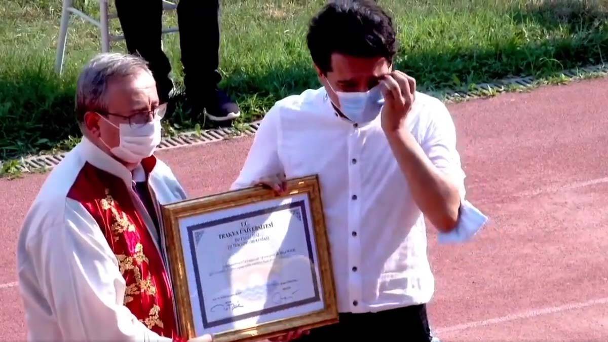 Trakya Üniversitesi (TÜ) Tıp Fakültesi’nde, eğitimini tamamlayan 23’ü yabancı uyruklu, 235 öğrenci törenle mezuniyet belgelerini aldı. Sosyal medyadan canlı yayınlanan törende, kanserden yaşamını yitiren tıp öğrencisi Rüya Maviş’in mezuniyet belgesini alan ağabeyi Güven Maviş ve Rektör Prof. Dr. Erhan Tabakoğlu birbirlerine sarılıp duygu dolu anlar yaşadı. Maviş ve Prof. Dr. Tabakoğlu gözyaşlarını tutamadı.