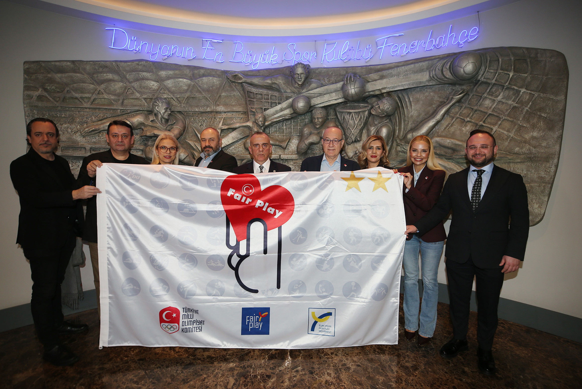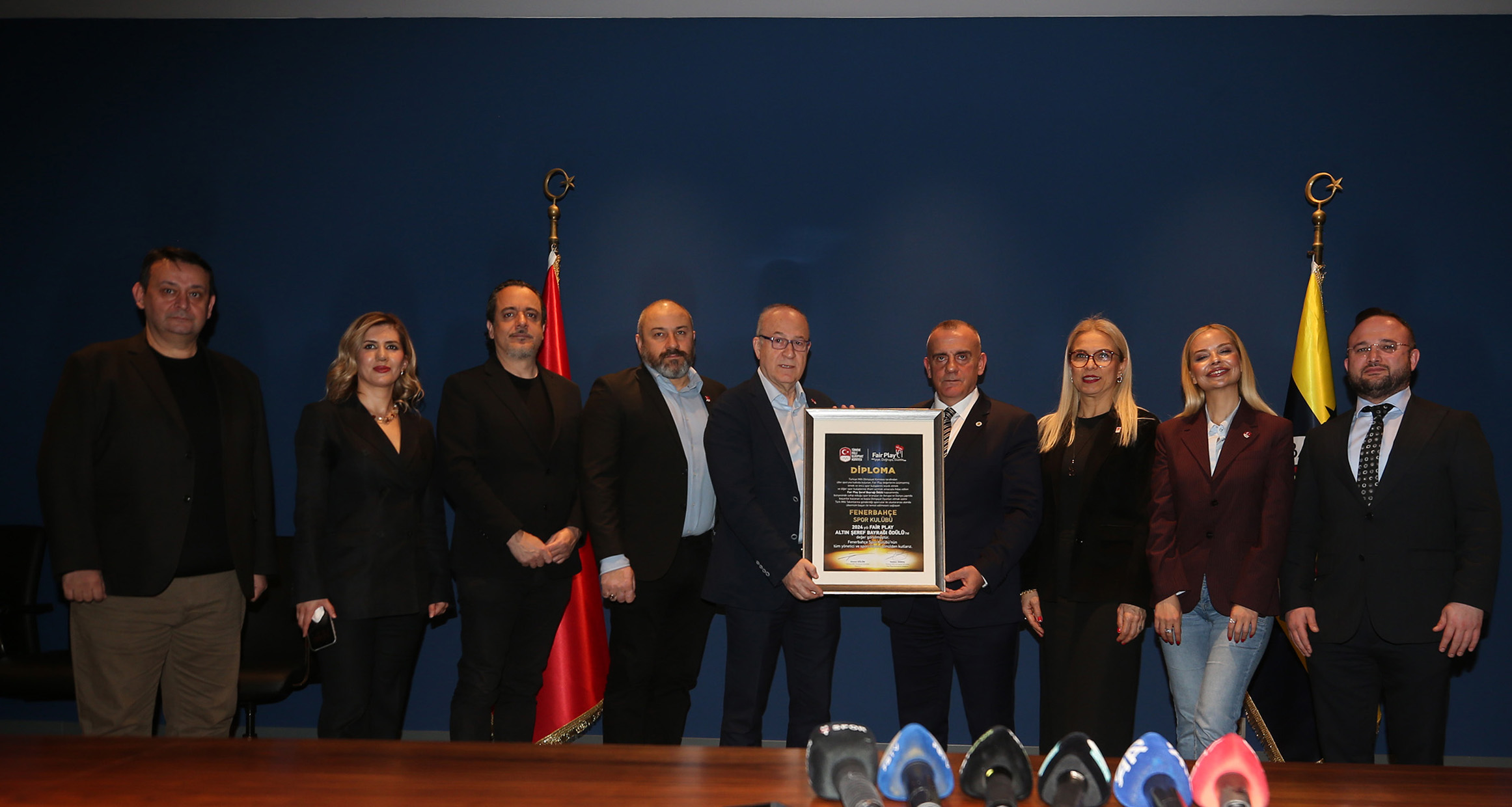 Türkiye Milli Olimpiyat Komitesi (TMOK) Fair Play Komisyonu Başkanı Haldun Domaç ise “Tmok Fair Play Komisyonu olarak bir önceki dönem başlattığımız Fair Play Altın Şeref Bayrağı ile ilgili bir çalışmamız vardı. Bu çalışmamızın birincisinde Fair Play Altın Şeref Bayrağı’nı Fenerbahçe kazanmıştı. Şimdi ikincisini de yine Fenerbahçe’ye takdim edeceğiz. Fair Play Altın Şeref Bayrağı; Olimpiyatlara en fazla sporcu gönderen ayrıca Türk sporuna hizmet noktasında çok önemli katkılar veren, Fair play ruhunu çok doğru bir şekilde sporcularına ve ülke sporuna yansıtan Fenerbahçe Kulübü açık ara bir oylamayla bu başarıyı elde etti. Bugün burada o bayrağı teslim etmek için geldik. Fenerbahçe bu bayrağı ikinci kez kazanıyor. Biz galiba Fenerbahçe Kulübü’ne bol bol bayrak ve sertifika yaptıracağız. Kendilerine çok teşekkür ediyoruz. Sporcu göndermenin yanında gönderdiği sporcuların fair play ruhunu yansıtması da bizim Fair Play Altın Şeref Bayrağı olmasını sağlayan unsur diye düşünüyoruz. Altyapıyı da bu şekilde destekleyen bir görüntü çıkıyor. Bu da bizi mutlu ediyor” sözlerini sarf etti.