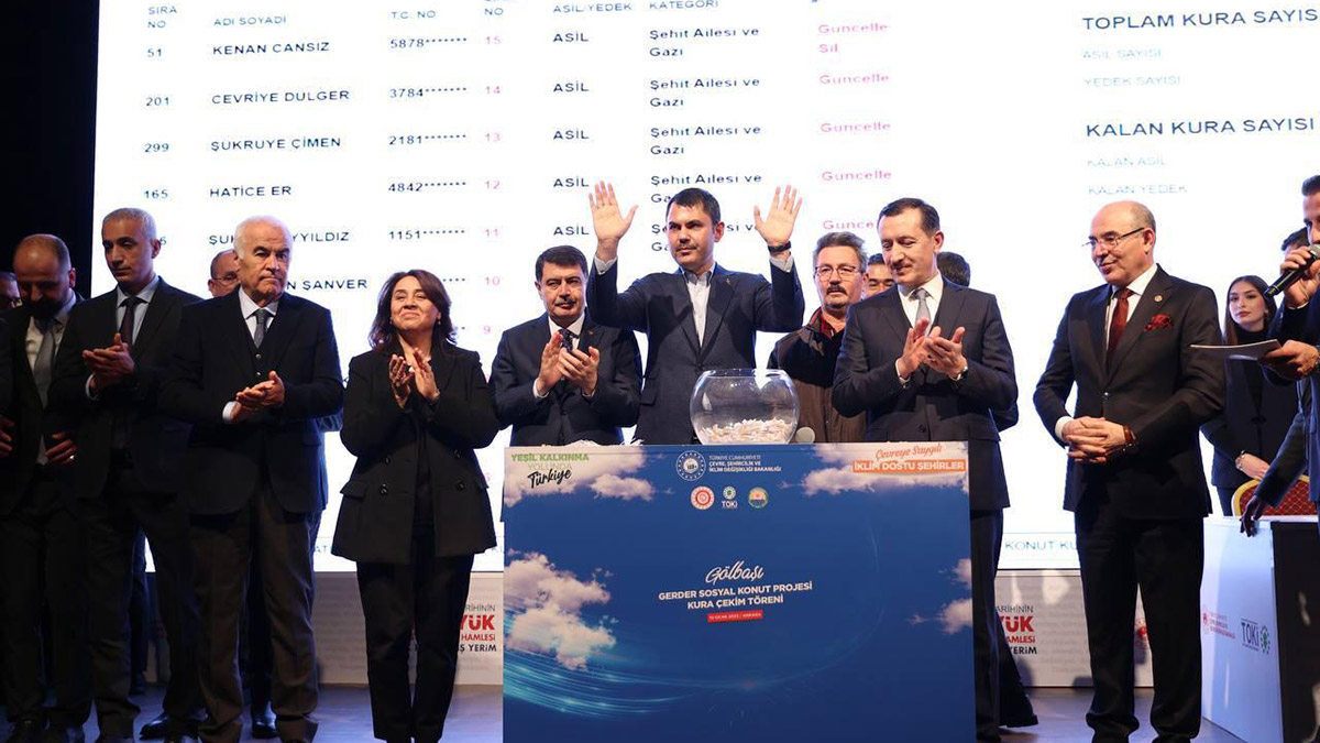 Çevre, Şehircilik ve İklim Değişikliği Bakanı Kurum, Ankara’da ‘İlk Evim, İlk İş Yerim’ projesi kapsamında gerçekleştirilen ‘Gölbaşı Gerder Sosyal Konut Projesi Kura Çekim Töreni’ne katıldı. Bakan Kurum, konuşmasında, Gölbaşı Millet Bahçesi’ni mart ayında tamamlayıp, açacaklarını ve Mogan Gölü’ndeki temizlik çalışmalarının çoğunu tamamlandıklarını söyledi. Kurum, bugün toplam 1545 konutun hak sahibinin belirleneceğini kaydederek, “Ankara’mızda kura çekimlerine 2 Ocak’ta başladık. Bugüne kadar 13 bin 309 hak sahibimizi belirledik” dedi.