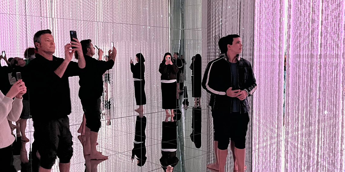 Japonya’nın başkenti Tokyo’da 2018 yılında açılan ve sanatçılar, programcılar, mühendisler, bilgisayar animatörleri, matematikçiler ve mimarlardan oluşan bir grup tarafından sanat üretilen Teamlab Sergisi, kentin en çok ilgi çeken yerlerinden biri. Birden fazla sergi alanlarında farklı temalardaki sergiler, izleyicileri sergiye dahil eden bir konsepte hazırlanmış. Dizlere kadar ılık suyun içine giren izleyiciler, suya yansıtılan ışıklarla dolu havuzda dijital sanatı izliyor. Yerlere ayna döşenmiş bir başka sergi alanında ise ışık yansıtan ve yere kadar uzanan ışıklı fiber sicimler, müzik eşliğinde sonsuzluk ve sınırsızlık deneyimi yaşatıyor.