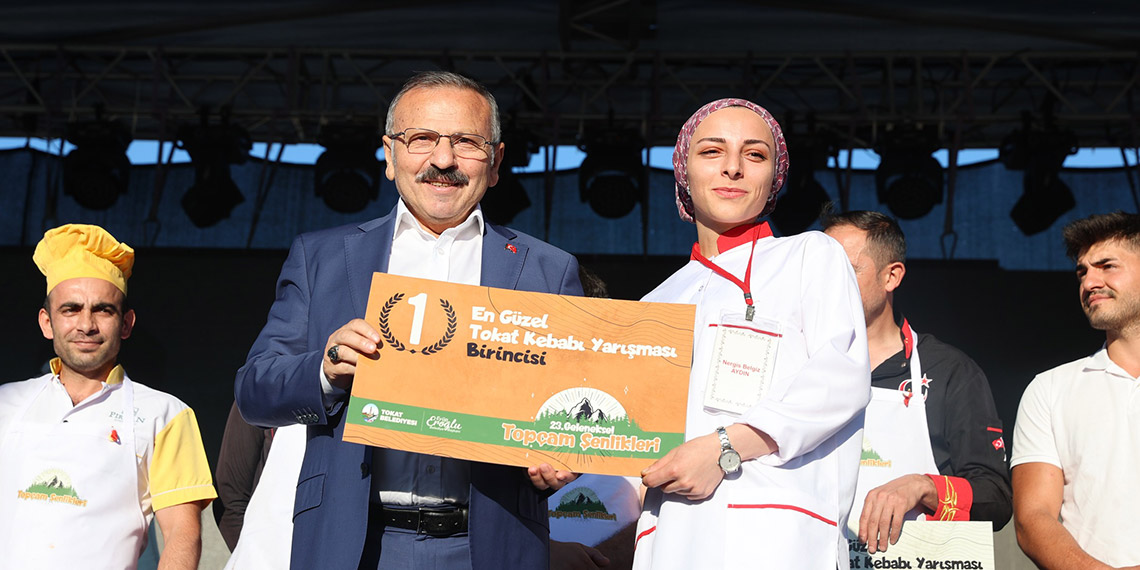 Tokat’ta, Topçam Şenlikleri kapsamında Tokat’ın tescilli ürünü Tokat kebabı yapma yarışmasını 7 erkek ustaya karşı yarışan Nergis Aydın (24) kazandı. Nergis Aydın, “Bu geleneksel yarışma için çok iyi hazırlandım. Birinci gelerek altının sahibi oldum. Ustalarıma beni destekleyenlere çok teşekkür ediyorum” dedi.