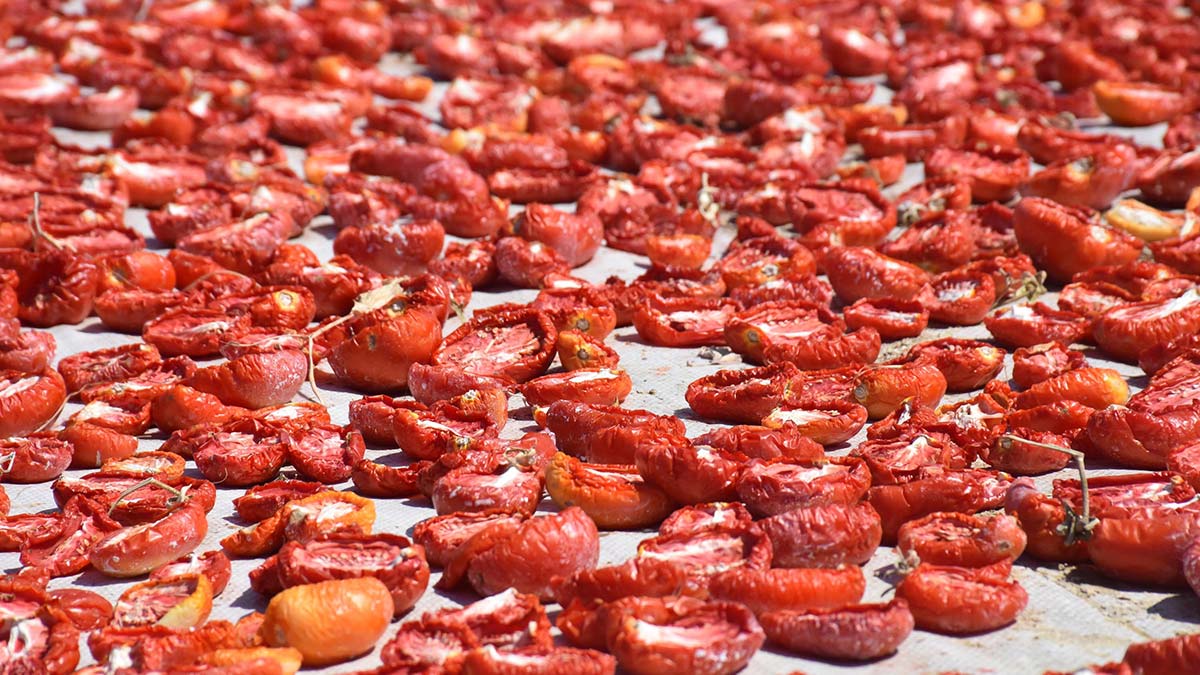 Türkiye’de kurutulmuş domates ihracatının 3’te 2’sinin yapıldığı, İzmir’in Torbalı ilçesinde domatesler, oluşturulan sergilerde kavurucu sıcakta özenle kurutuluyor. 6-7 gün içinde kuruyan domatesler, ABD ve Almanya ile Belçika dahil 100’e yakın ülkeye ihraç ediliyor.