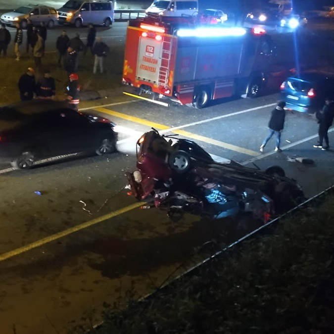 Kaza, saat 01.30 sıralarında Yomra ilçesi Karadeniz Sahil Yolu’nda meydana geldi. Giresun istikametine giden sürücüsü belirlenemeyen 61 SL 480 plakalı otomobil, kontrolden çıkıp, takla atarak geçtiği karşı şeritte 61 NA 722 plakalı otomobil ile çarpıştı. Takla atan otomobil ters dönerken, diğer otomobil de refüje çıktı. Ters dönen otomobildeki Özgür Aydın ile Mücahit Sarı, kaza yerinde hayatını kaybetti, diğer araçtaki Erdem K. ile Onur Ç. ağır yaralandı.