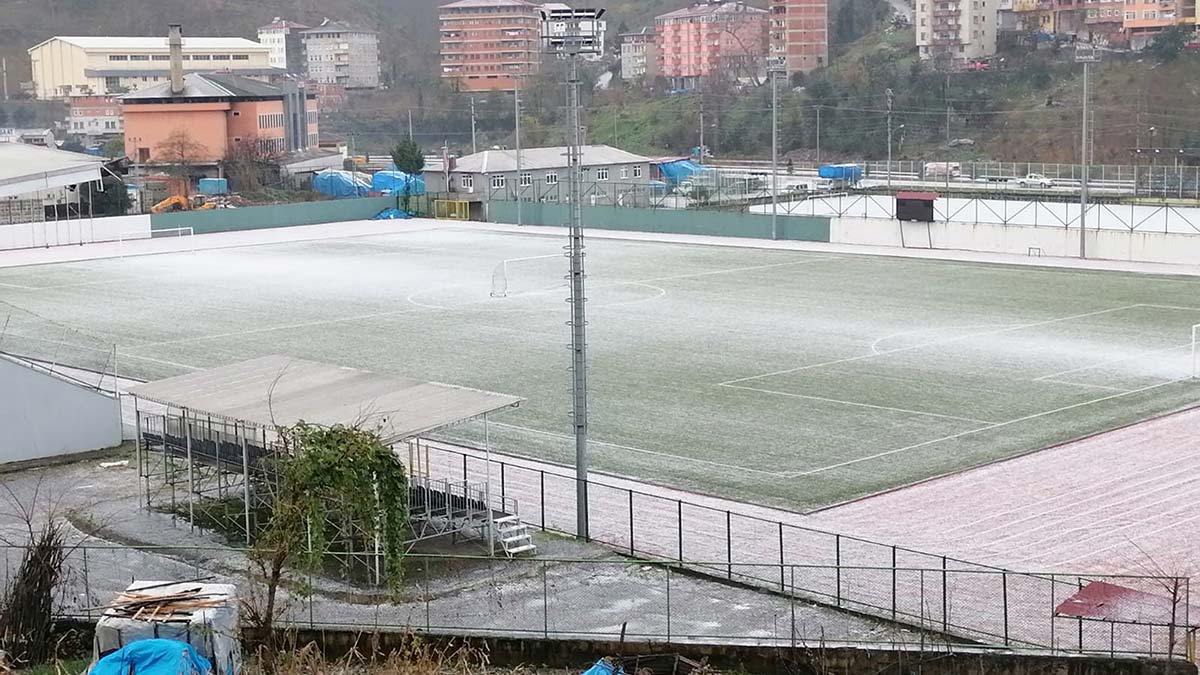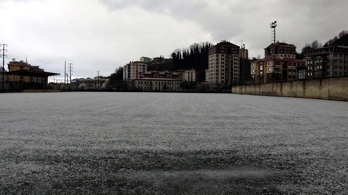 Doğu Karadeniz Bölgesi’nde soğuk ve yağışlı hava etkili oluyor. Trabzon’un Sürmene ilçesinde öğle saatlerinde dolu yağarken, cadde ve sokaklar beyaza büründü. İlçe merkezindeki futbol sahasının çim zemini de dolu sonrası bembeyaz oldu.
