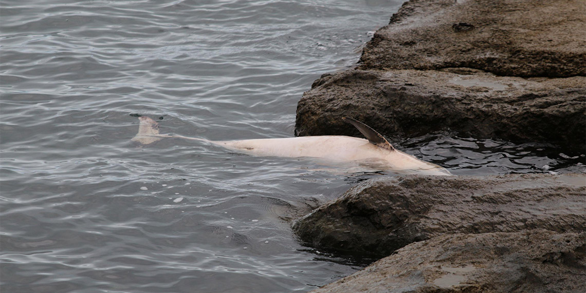 Trabzon’da ölü yunus, sahilde kayalığa vurdu. Balıklı Mahallesi sahilinde yürüyüş yapanlar, kayalıklarda hareketsiz bir yunus olduğunu fark etti.