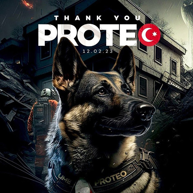 Vefasını ve minnettarlığını koreografiye yansıtan taraftarlar, Meksika’dan gelen 150 kişilik ekibin arama kurtarma köpeği Proteo’yu da resmetti. Adıyaman’da enkaz altındaki 3 kişinin kurtarılmasında önemli rol oynayan ve operasyon sırasında hayatını kaybeden Proteo’ya ‘teşekkür’ mesajıyla gösterilen saygı, dünya basınında yankı uyandırdı. Ölümüyle ülkesini yasa boğan Proteo’nun yer aldığı ve Trabzonspor-Basel maçında sergilenen koreografi, sosyal medya sayfalarında binlerce kez paylaşıldı.