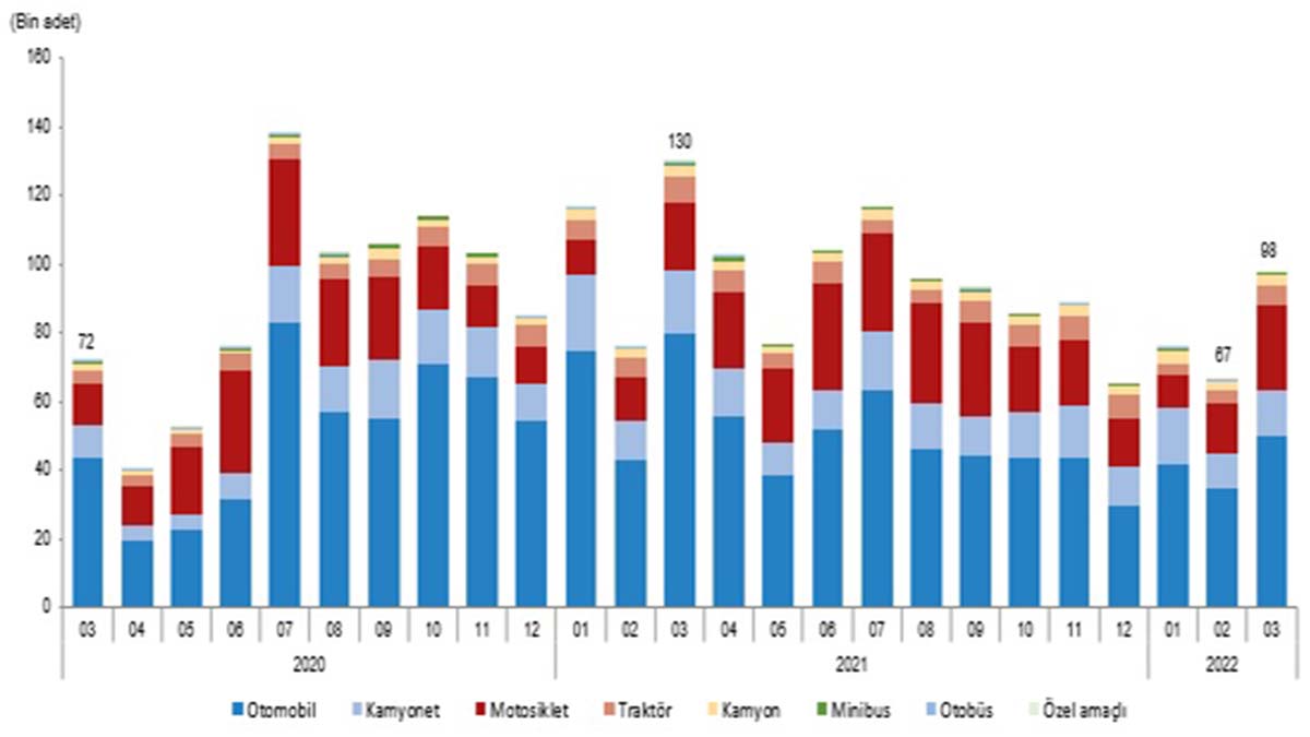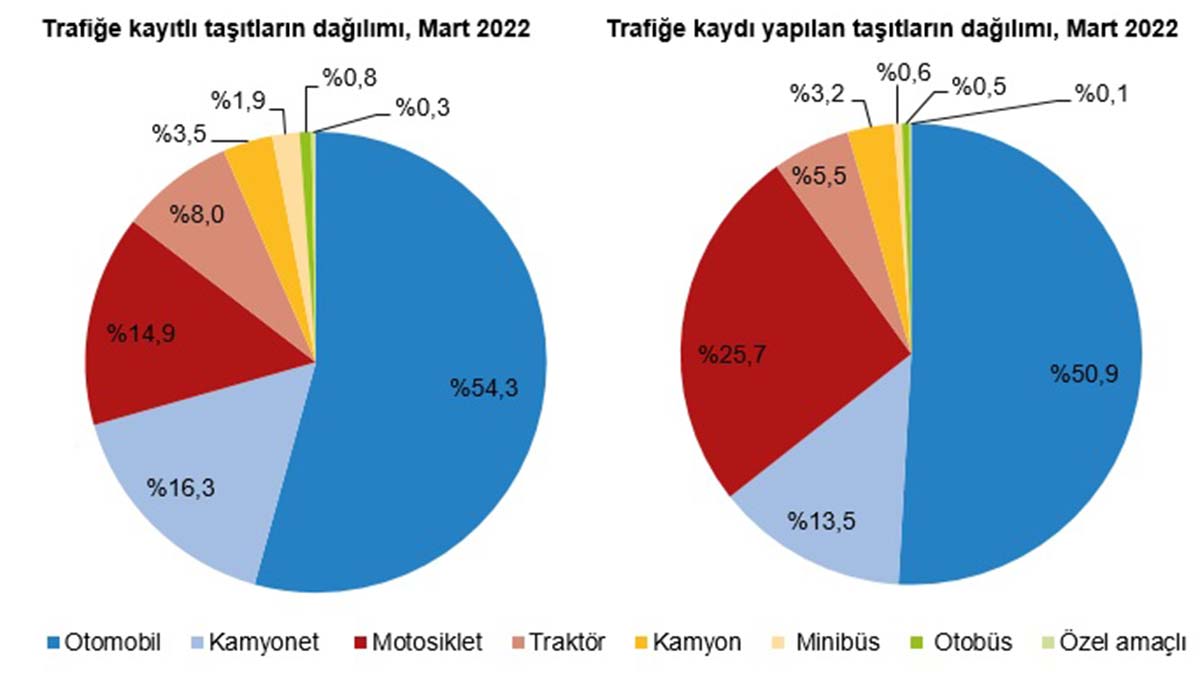 TÜİK, 2022 yılı Mart ayı motorlu kara taşıtları istatistiklerini açıkladı. Buna göre, mart ayında trafiğe kaydı yapılan taşıtların yüzde 50,9’unu otomobil, yüzde 25,7’sini motosiklet, yüzde 13,5’ini kamyonet, yüzde 5,5’ini traktör, yüzde 3,2’sini kamyon, yüzde 0,6’sını minibüs, yüzde 0,5’ini otobüs ve yüzde 0,1’ini özel amaçlı taşıtlar oluşturdu. Mart ayında 97 bin 974 taşıtın trafiğe kaydı yapıldı.