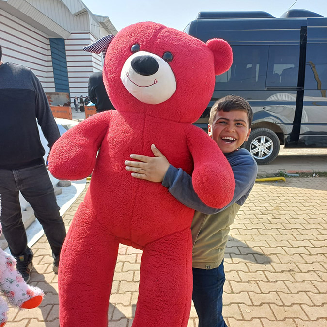 Peluş oyuncak alan depremzede Ecrin Demirel, “Beşiktaş’ı çok seviyorum. Beşiktaş bize oyuncaklar yolluyor. Onlarla burada oyunlar oynuyoruz. Oyuncak dağıtımı bizi çok sevindirdi. Beşiktaş’a sevgi, saygı ve selamlarımı gönderiyorum” ifadelerini kullandı.