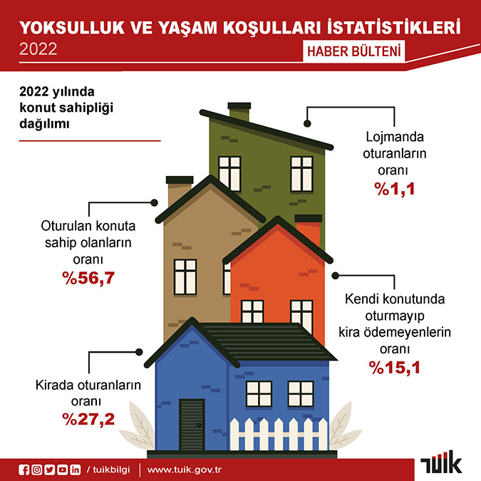 Oturulan konuta sahip olanların oranı geçen yıla göre 0,8 puan azalarak 2022 yılında yüzde 56,7 olurken; kirada oturanların oranı yüzde 27,2, lojmanda oturanların oranı yüzde 1,1, kendi konutunda oturmayıp kira ödemeyenlerin oranı ise yüzde 15,1 oldu.