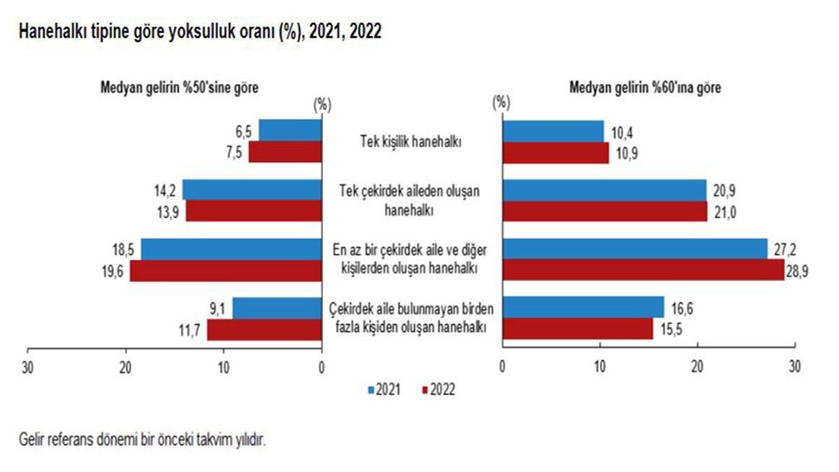 TÜİK, 2022 yılına ilişkin yoksulluk ve yaşam koşulları istatistiklerini açıkladı. Buna göre; ‘eş değer hanehalkı kullanılabilir fert medyan geliri’nin yüzde 50’si dikkate alınarak belirlenen yoksulluk sınırına göre yoksulluk oranı, 2022 yılında aynı düzeyde kalarak yüzde 14,4 oldu. ‘Medyan gelir’in yüzde 60’ı dikkate alınarak belirlenen yoksulluk oranı 0,3 puan artarak yüzde 21,6, yüzde 40’ı dikkate alınarak belirlenen yoksulluk oranı 0,9 puanlık azalış ile yüzde 7,6, yüzde 70’i dikkate alınarak hesaplanan yoksulluk oranı ise bir önceki yıla göre 0,6 puanlık artış ile yüzde 29,3 oldu.