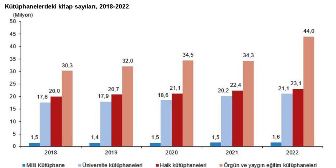 TÜİK, 2022 yılına ilişkin kütüphane istatistiklerini açıkladı. Buna göre; 2022 yılında kütüphane sayısı 1 Milli Kütüphane, 1257 halk kütüphanesi, 625 üniversite kütüphanesi ve 47 bin 654 örgün ve yaygın eğitim kurumu kütüphanesi olmak üzere toplam 49 bin 537 oldu. Kitap sayıları, bir önceki yıla göre; Milli Kütüphane’de yüzde 5,6 artarak 1 milyon 632 bin 589, üniversite kütüphanelerinde yüzde 4,6 artarak 21 milyon 98 bin 691, halk kütüphanelerinde yüzde 3,3 artarak 23 milyon 91 bin 168, örgün ve yaygın eğitim kurum kütüphanelerinde yüzde 28,1 artarak 43 milyon 971 bin 809 olarak belirlendi.