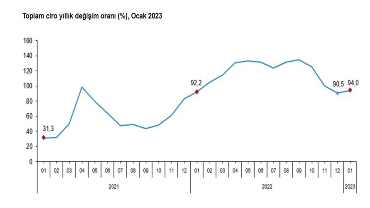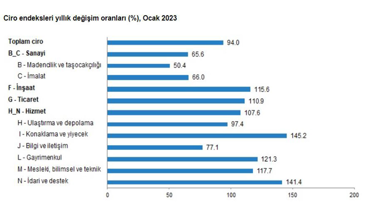 Toplam cironun alt detaylarına bakıldığında; 2023 Ocak ayında yıllık sanayi sektörü ciro endeksi yüzde 65,6, inşaat ciro endeksi yüzde 115,6, ticaret ciro endeksi yüzde 110,9, hizmet ciro endeksi yüzde 107,6 arttı. Sanayi, inşaat, ticaret ve hizmet sektörleri toplamında ciro endeksi, 2023 Ocak ayında aylık yüzde 8,3 arttı. Toplam cironun alt detaylarına bakıldığında; 2023 Ocak ayında aylık sanayi sektörü ciro endeksi yüzde 5,8, inşaat ciro endeksi yüzde 8,5, ticaret ciro endeksi yüzde 9,8, hizmet ciro endeksi yüzde 8,9 arttı.