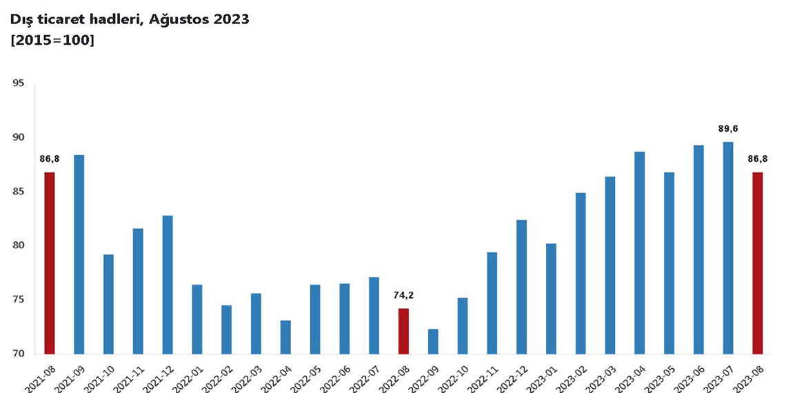 Türkiye İstatistik Kurumu’nun (TÜİK) verilerine göre dış ticaret haddi ağustos ayında geçen yılın aynı ayına göre 12,6 puan artarak 86,8 oldu.