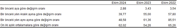 TÜİK, Ekim 2024 dönemine ilişkin enflasyon verilerini açıkladı. Ekim ayında tüketici fiyat endeksindeki (TÜFE) değişim bir önceki aya göre yüzde 2,88, bir önceki yılın aralık ayına göre yüzde 39,77, bir önceki yılın aynı ayına göre yüzde 48,58 ve 12 aylık ortalamalara göre yüzde 62,02 olarak gerçekleşti.