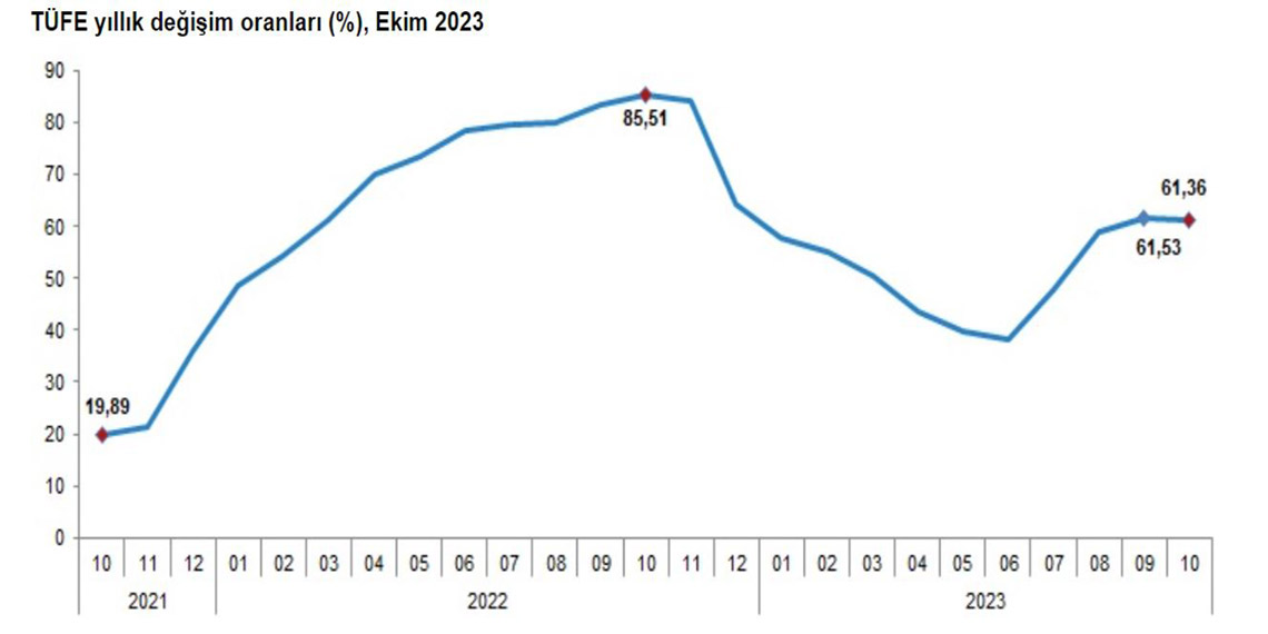 TÜİK, Ekim 2023 dönemine ilişkin enflasyon verilerini açıkladı. Tüketici fiyat endeksi (TÜFE) bir önceki aya göre yüzde 3,43, bir önceki yılın aralık ayına göre yüzde 55, bir önceki yılın aynı ayına göre yüzde 61,36 ve 12 aylık ortalamalara göre yüzde 54,26 arttı.