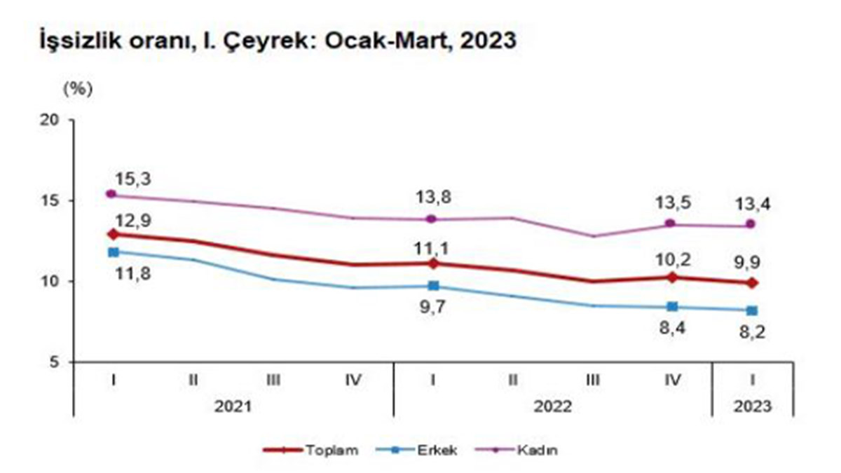 Türkiye İstatistik Kurumu’nun (TÜİK), verilerine göre İşsizlik oranı 1’inci çeyrekte 0,3 puan azalarak yüzde 9,9 seviyesinde gerçekleşti.