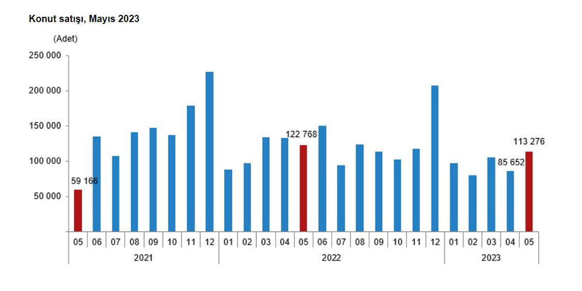 TÜİK, mayıs ayı konut satış istatistiklerini açıkladı. Buna göre, mayıs ayında Türkiye genelindeki konut satışları bir önceki yılın aynı ayına göre yüzde 7,7 azalarak 113 bin 276 oldu. Konut satışlarında İstanbul 18 bin 435 konut satışı ve yüzde 16,3 ile en yüksek paya sahip oldu. Satış sayılarına göre İstanbul’u 11 bin 196 konut satışı ve yüzde 9,9 pay ile Ankara, 6 bin 158 konut satışı ve yüzde 5,4 pay ile Antalya izledi. Konut satış sayısının en az olduğu iller sırasıyla 18 konut ile Ardahan, 38 konut ile Hakkari, 55 konut ile Bayburt ve Tunceli oldu. Konut satışları ocak-mayıs döneminde bir önceki yılın aynı dönemine göre yüzde 16,3 azalışla 482 bin 143 olarak gerçekleşti.