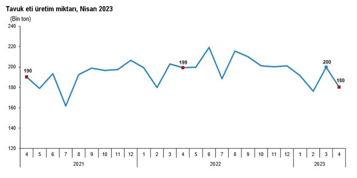 TÜİK, Nisan 2023 dönemine ilişkin kümes hayvancılığı ile süt ve süt ürünleri üretimi istatistiklerini açıkladı. Buna göre; nisan ayında bir önceki yılın aynı ayına göre tavuk yumurtası üretimi yüzde 3,6 ve hindi eti üretimi yüzde 0,3 artarken; tavuk eti üretimi yüzde 9,4 ve kesilen tavuk sayısı yüzde 12,7 azaldı. Ocak-nisan döneminde bir önceki yılın aynı dönemine göre tavuk yumurtası üretimi yüzde 3,8 artarken; tavuk eti üretimi yüzde 4,2, hindi eti üretimi yüzde 7,1 ve kesilen tavuk sayısı yüzde 7,8 azaldı.