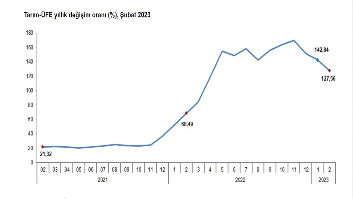 TÜİK, Şubat 2023’e ilişkin tarım ürünleri üretici fiyat endeksi verilerini açıkladı. Buna göre; Tarım-ÜFE’de şubat ayında bir önceki aya göre yüzde 6,58, bir önceki yılın aralık ayına göre yüzde 18,40, bir önceki yılın aynı ayına göre yüzde 127,56 ve 12 aylık ortalamalara göre yüzde 142,90 artış gerçekleşti. Sektörlerde bir önceki aya göre; tarım ve avcılık ürünleri ve ilgili hizmetlerde yüzde 6,41 artış, balık ve diğer balıkçılık ürünlerinde yüzde 10,68 artış ve ormancılık ürünleri ve ilgili hizmetlerde yüzde 10,91 artış gerçekleşti. Ana gruplarda bir önceki aya göre; çok yıllık bitkisel ürünlerde yüzde 0,95 azalış, canlı hayvanlar ve hayvansal ürünlerde yüzde 6,32 artış ve tek yıllık bitkisel ürünlerde yüzde 10,80 artış yaşandı.