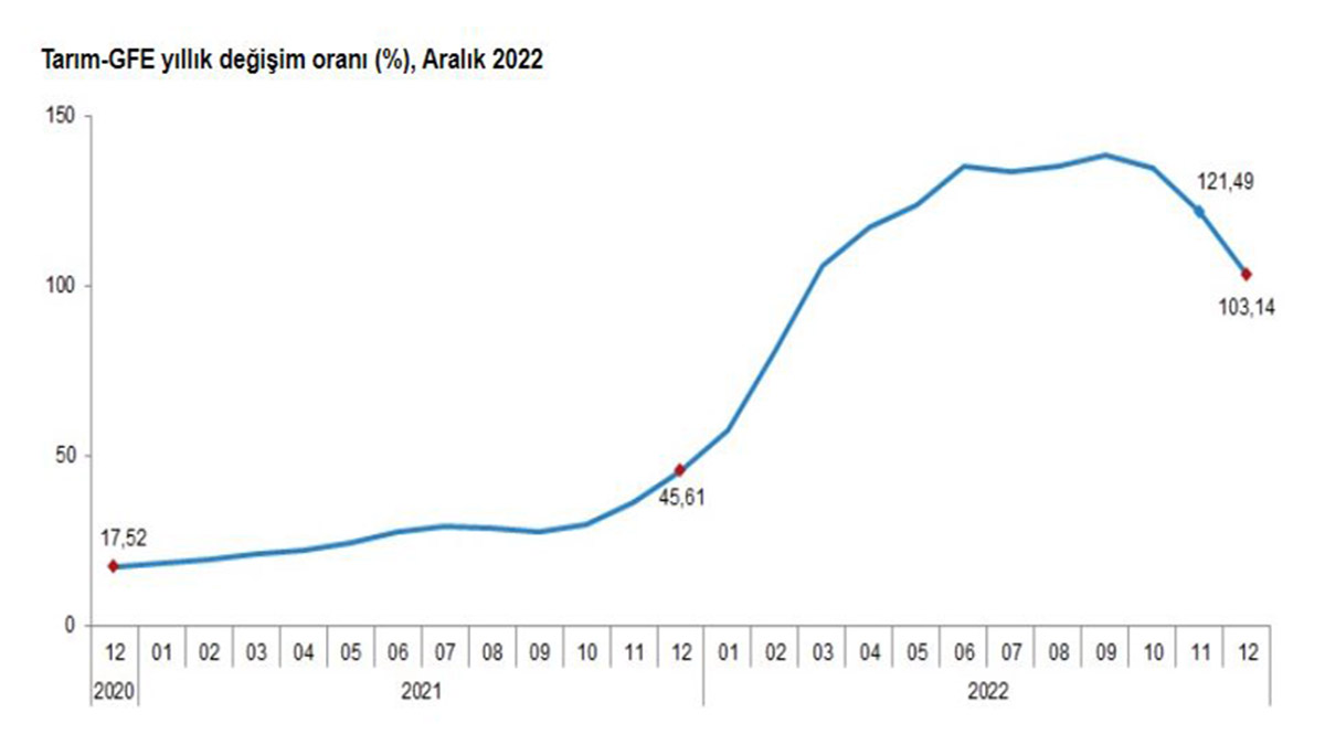 TÜİK, Aralık 2022 dönemi tarımsal girdi fiyat endeksini açıkladı. Buna göre, tarımsal girdi fiyat endeksinde Aralık 2022’de bir önceki aya göre yüzde 0,72, Aralık 2021’e göre yüzde 103,14 ve 12 aylık ortalamalara göre yüzde 116,26 artış gerçekleşti. Ana gruplarda bir önceki aya göre, tarımda kullanılan mal ve hizmet endeksinde yüzde 0,33, tarımsal yatırıma katkı sağlayan mal ve hizmet endeksinde yüzde 3,64 artış gerçekleşti. Bir önceki yılın aynı ayına göre göre, tarımsal yatırıma katkı sağlayan mal ve hizmet endeksinde yüzde 94,35, tarımda kullanılan mal ve hizmet endeksinde yüzde 104,42 artış gerçekleşti.