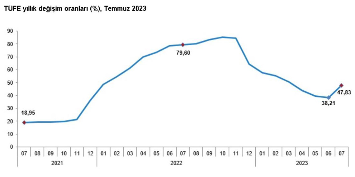 Türkiye İstatistik Kurumu (TÜİK), temmuz ayı enflasyon oranlarının yıllık yüzde 47,83, aylık yüzde 9,49 olduğunu açıkladı.