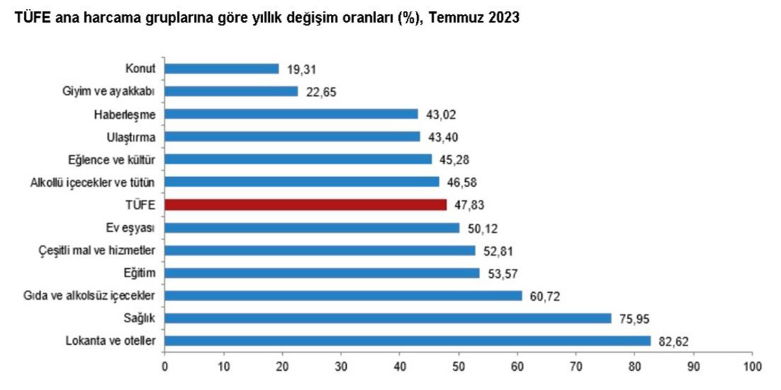 TÜFE yıllık değişim oranlarına bakıldığında, en az artış gösteren ana grup yüzde 19,31 ile konut oldu. Artışın en yüksek olduğu ana grup, yüzde 82,62 ile lokanta ve oteller oldu. Aylık değişim oranlarında ise temmuz ayında bir önceki aya göre en az artış gösteren ana grup yüzde 2,67 ile eğitim oldu. Temmuz ayında bir önceki aya göre artışın en yüksek olduğu ana grup, yüzde 17,75 ile ulaştırma oldu.