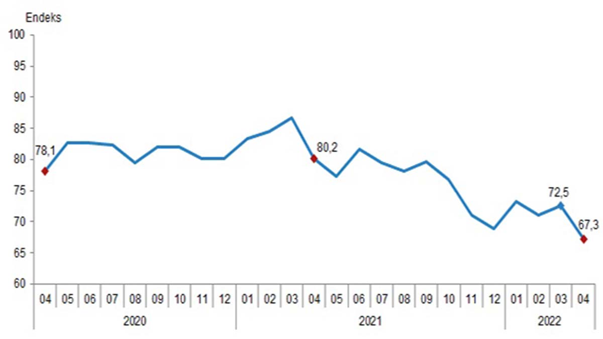 Tüketici güven endeksi, nisan ayında bir önceki aya göre yüzde 7,3 oranında azalarak 67,3 oldu.
