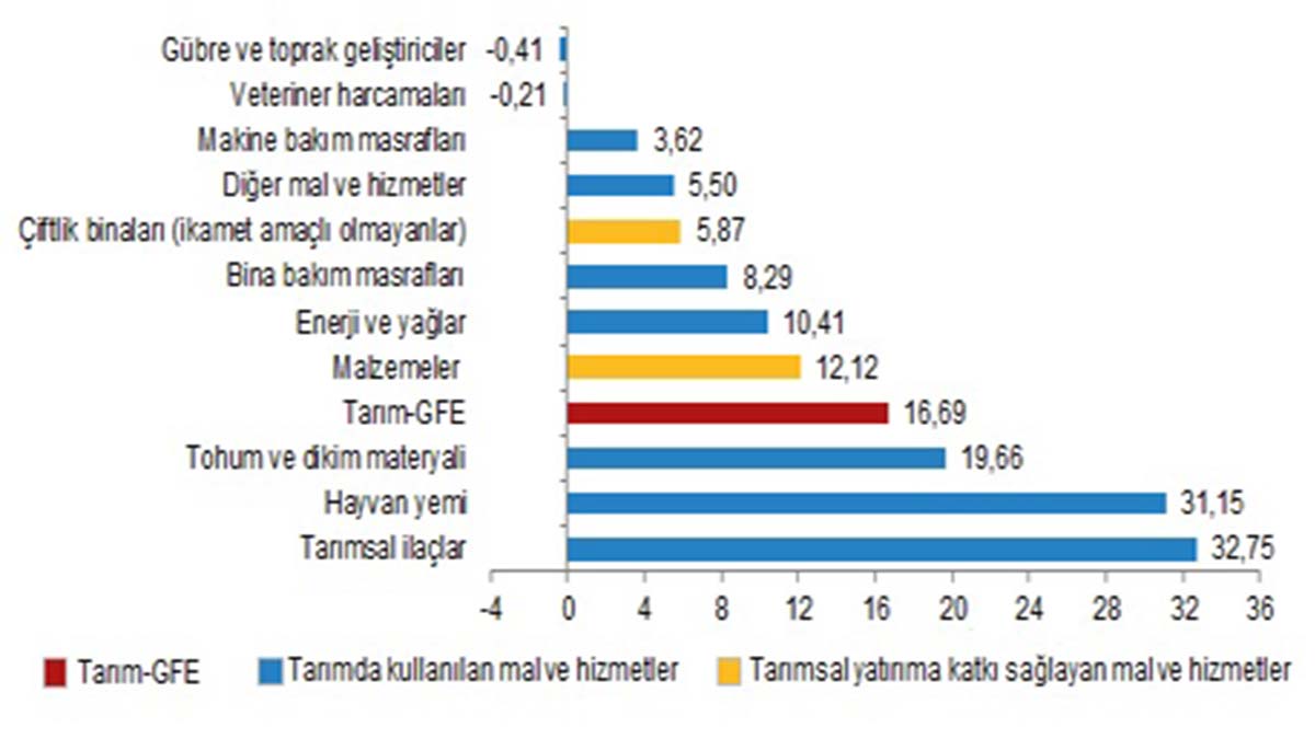 Yıllık artışın düşük olduğu alt gruplar sırasıyla, yüzde 23,88 ile veteriner harcamaları ve yüzde 27,91 ile malzemeler oldu. Buna karşılık, yıllık artışın yüksek olduğu alt gruplar ise sırasıyla yüzde 138,11 ile gübre ve toprak geliştiriciler ve yüzde 121,77 ile enerji ve yağlar oldu.