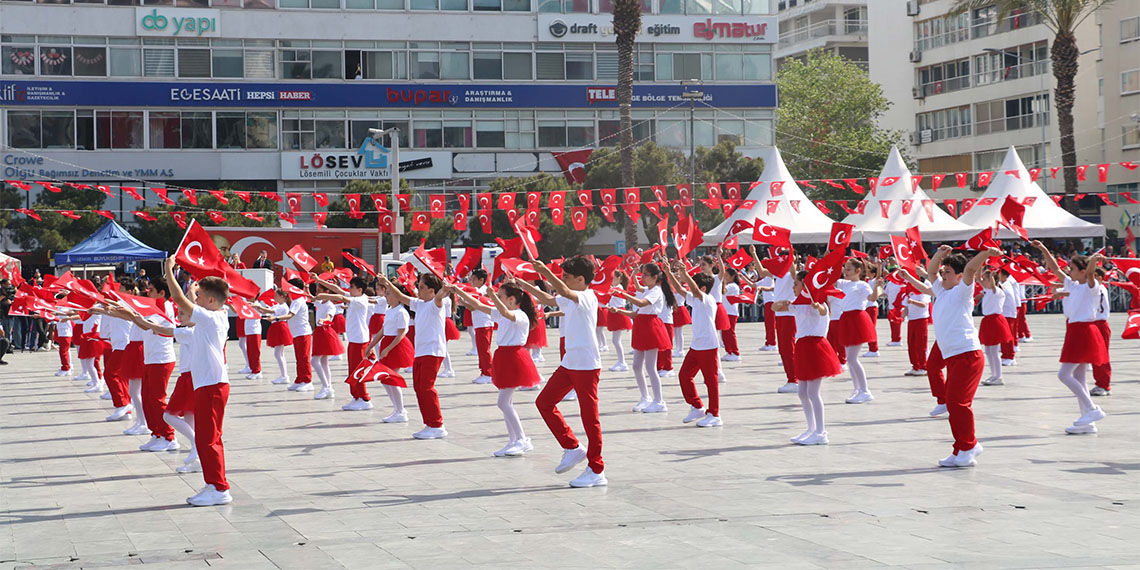İzmir’de, 23 Nisan Ulusal Egemenlik ve Çocuk Bayramı’nın 105’inci yıl dönümü Cumhuriyet Meydanı’nda düzenlenen törenle kutlandı. Kutlamalara İzmir Valisi Süleyman Elban, İzmir Büyükşehir Belediye Başkanı Cemil Tugay, Ege Ordusu ve Garnizon Komutanı Orgeneral İrfan Özsert, İl Milli Eğitim Müdürü Ömer Yahşi, siyasi partilerin ve sivil toplum kuruluşlarının temsilcileri, öğrenci ve öğretmenler ile vatandaşlar katıldı. Kutlamalar meydandaki Atatürk Anıtı’na İzmir İl Milli Eğitim Müdürü Ömer Yahşi’nin çelenk bırakmasıyla başladı. Törende İlkokulu öğrencileri ‘Parla’ marşı ile ‘Haydi Türkiye’ marşını seslendirdi. Ortaokul öğrencileri ise Efeler gösterisi yaptı. ‘Bir Anadolu Masalı’ öğrenci grup gösterileri ve ortaokulların ‘Kırmızı Beyaz’ flama öğrenci grup gösterileri ile devam etti. Son olarak ilkokul ve ortaokul öğrencileri ‘Dalgalan Şanlı Bayrağım’ gösterisi gerçekleştirdi.