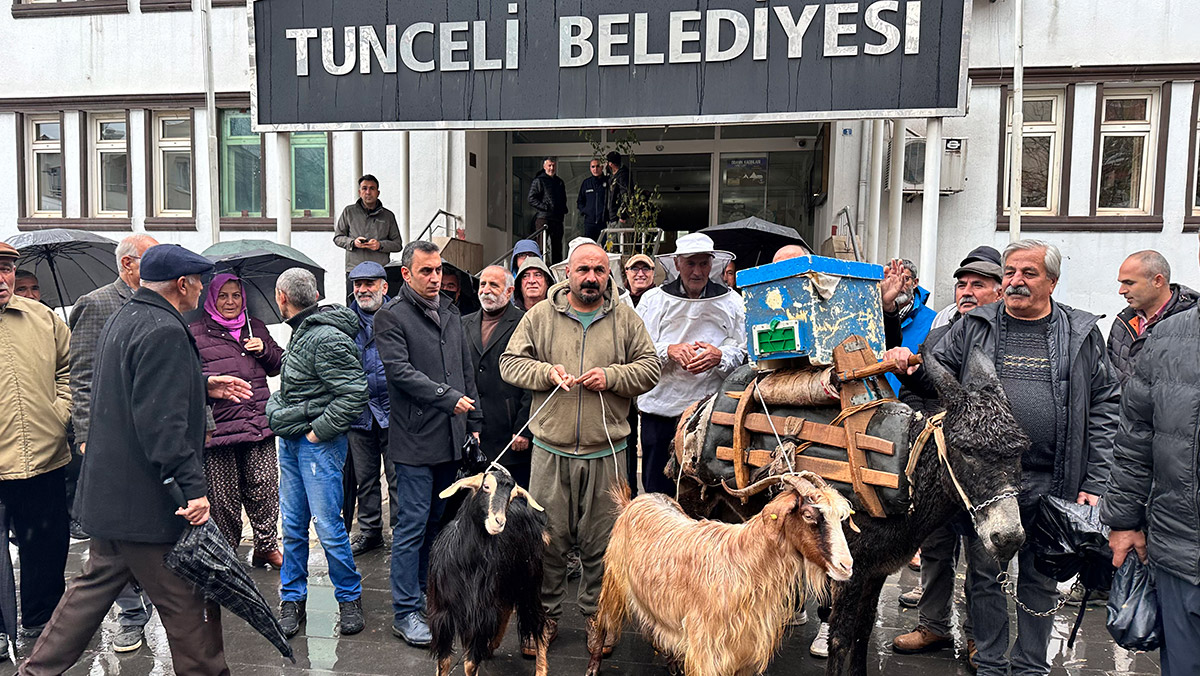 Bugün merkez ve 7 ilçe belediyesi tarafından DER-KAB (Dersim Katı Atık Birliği) toplantısının olacağını öğrenen köylüler, getirdikleri eşek, keçi, köpek ve arı kovanlarıyla belediye binası önünde protesto gerçekleştirdi. Köylüler, belediye başkanlarının projeden çekilmelerini istedi.