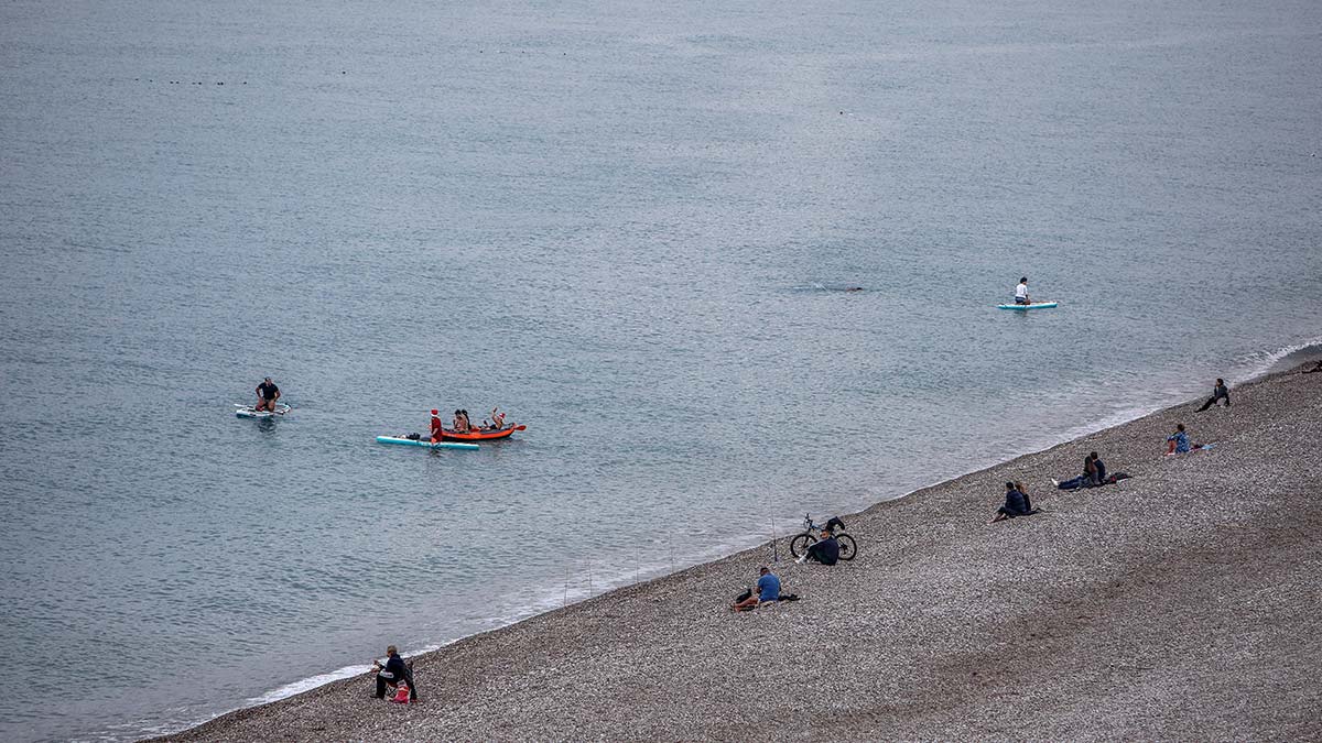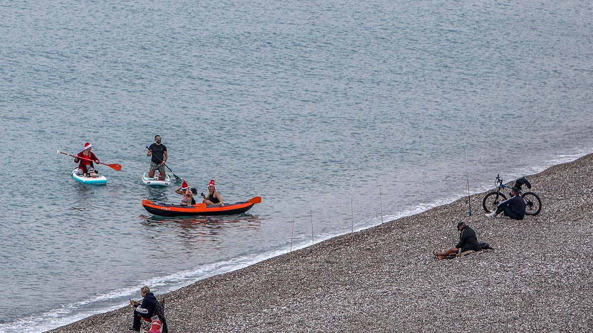 Sahilde 3 kadın bir erkekten oluşan turist grubu da kano yaptı. Turistlerin başlarındaki Noel şapkaları dikkati çekti. Birlikte şarkı söyleyerek kano küreklerini bir süre çeken turistler sahile çıkıp eğlencelerine devam etti.