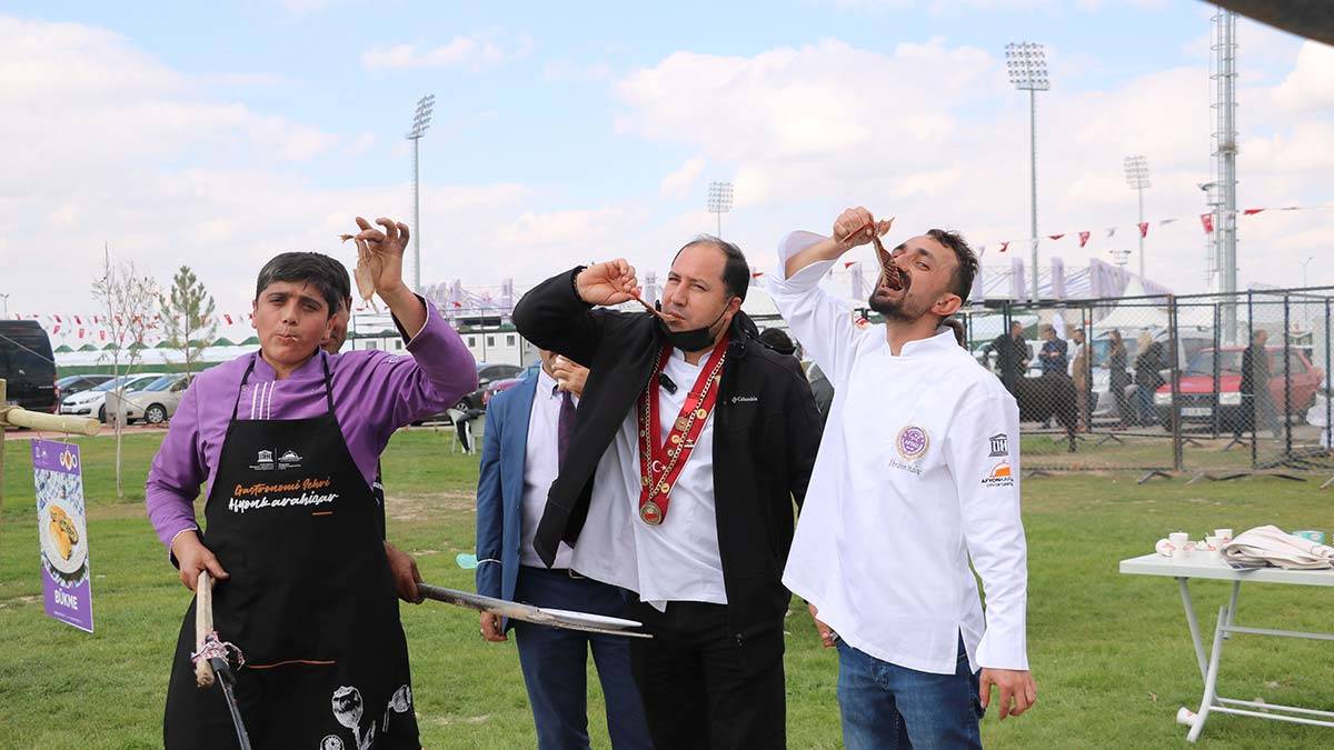 Afyonkarahisar‘da düzenlenen Gastro Afyon 3. Uluslararası Turizm ve Lezzet Festivali’nde kurulan mini mutfakta kente özgü yemek, börek, hamur işi ve tatlılar hazırlandı. 3 tonluk kazanda hazırlanan aşurenin de dağıtıldığı festivalin açılışına özel 2 tonluk boğa kesildi. Boğanın pişirilmesi için de yapılan dikey çukur, meşe kömürüyle ateşlendi.