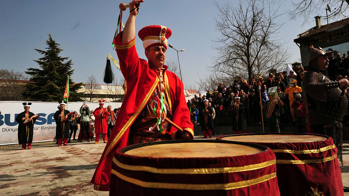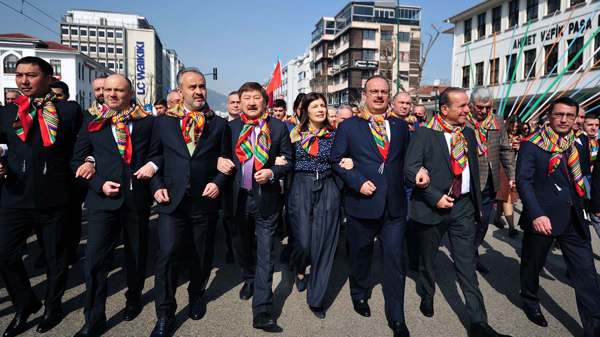 Bursa’nın ‘2022 Türk Dünyası Kültür Başkenti’ seçilmesi ile birlikte kentte yıl boyu etkinlikler düzenlenecek. 21 Mart Nevruz Bayramı ile başlayan etkinliklerin resmi açılışından önce, TÜRKSOY üyesi ülkelerin kültür bakanları ile diğer yetkililer kente geldi. Konuk heyetler, Vali Yakup Canbolat tarafından ağırlandı, daha sonra Tophane’deki Osman Gazi ile Orhan Gazi’nin türbeleri ziyaret edildi. Konuklar, Alplerin nöbet değişimini ilgiyle seyretti. Resmi törenin ilk ayağı, kortej yürüyüşü ile başladı. Protokol üyeleri, marşlar eşliğinde Atatürk, İnönü ve Cumhuriyet caddelerinde yürüdü. Saltanat Kapısı’ndan başlayan korteje; atlı birlikler, okçular, mehter takımı ve kılıç-kalkan ekibi de eşlik etti. Yürüyüş, renkli görüntülere sahne oldu.