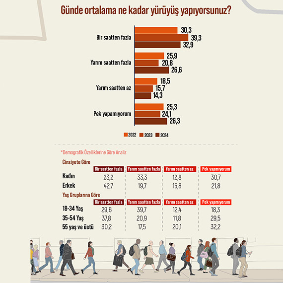 Araştırmaya katılanların yaş dağılımlarına bakıldığında, 18-34 yaş aralığındakiler arasında yüzde 18,3’ü gün içinde pek yürüyüş yapmadığını ifade ederken, yüzde 12,4’ü yarım saatten az yürüyor; yüzde 39,7’si yarım saatten fazla yürürken yüzde 29,6’sı bir saatten fazla yürüyüş yapıyor. 35-54 yaş aralığındakilerin yüzde 29,5’i gün içinde pek yürümezken, yüzde 11,8’i yarım saatten az yürüyüş yapıyor. Yüzde 20,9’u yarım saatten fazla yürüyüş yaparken yüzde 37,8’i bir saatten fazla yürüyor. 55 yaş ve üzerindeki katılımcıların yüzde 32,2’si gün içinde pek yürüyüş yapmadığını ifade ediyor. Yüzde 20,1’i yarım saatten az, yüzde 17,5’i yarım saatten fazla, Yüzde 30,2’si ise gün içinde bir saatten fazla yürüyor.