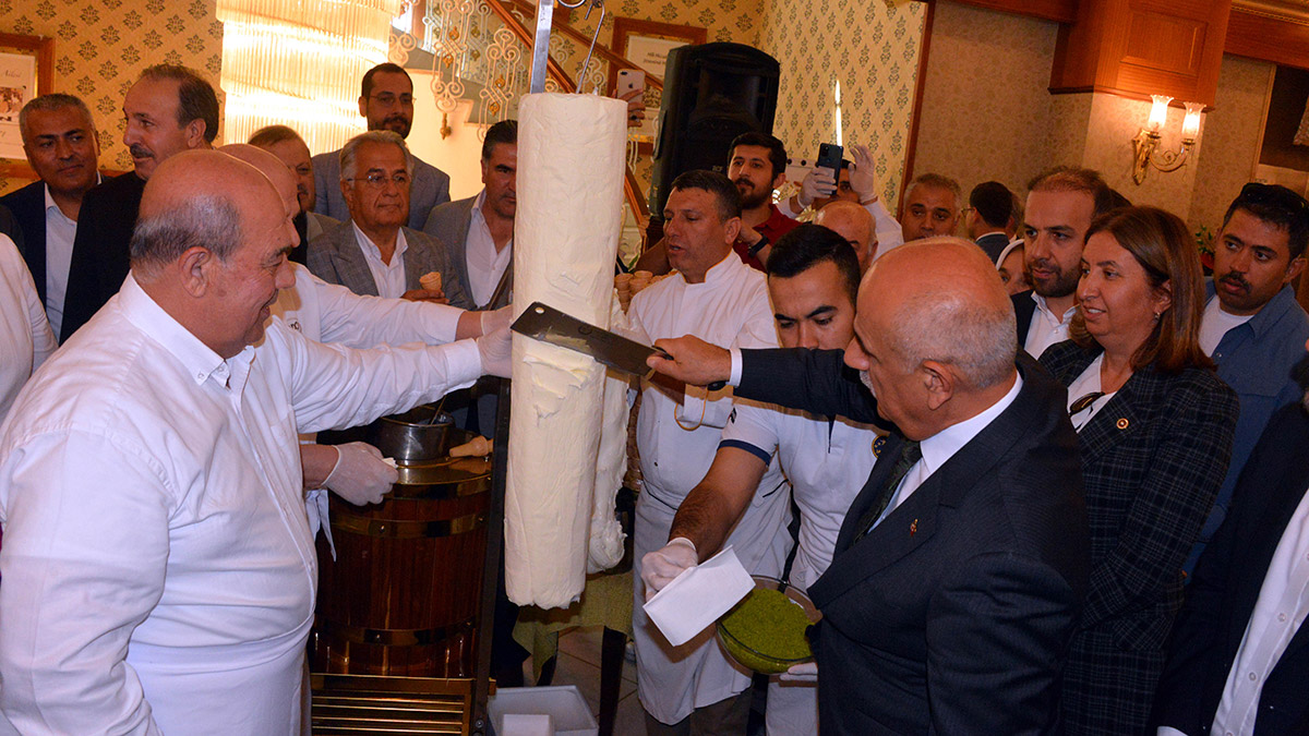 Tarım ve Orman Bakanı Vahit Kirişci, konuşmasının ardından satırla dondurma kesip davetlilere ikram etti.
