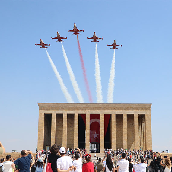 30 Ağustos Zafer Bayramı kutlamaları kapsamında Türk Yıldızları da Anıtkabir üzerinde saygı uçuşu yaptı. Anıtkabir’in üzerinde manevralar yapan Türk Yıldızları, izleyenlere heyecan dolu anlar yaşattı. Özellikle çocukların büyük ilgi gösterdiği gösteri uçuşunda pilotlar akrobatik hareketlere imza attı. Anıtkabir, Zafer Bayramı nedeniyle bugün saat 22.00’ye kadar ziyarete açık olacak.