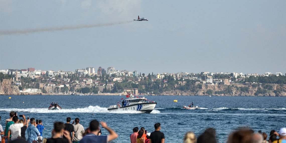 Uçaklar kimi zaman ise birbirlerine yakın geçişler yaparken, sahile yakın uçuş yapan bir uçağın pilotu sahildeki vatandaşlara el salladı. Türk Yıldızları’nın gösterisine bazı vatandaşlar da denizde tekneleriyle ortak oldu. Denizde ‘salma dairesi’ çizen tekneler ile Türk Yıldızları’nın aynı kareye girdiği anlar, güzellik oluşturdu. Gösterinin sonunda ise uçaklarla havada kalp şekli çizildi.