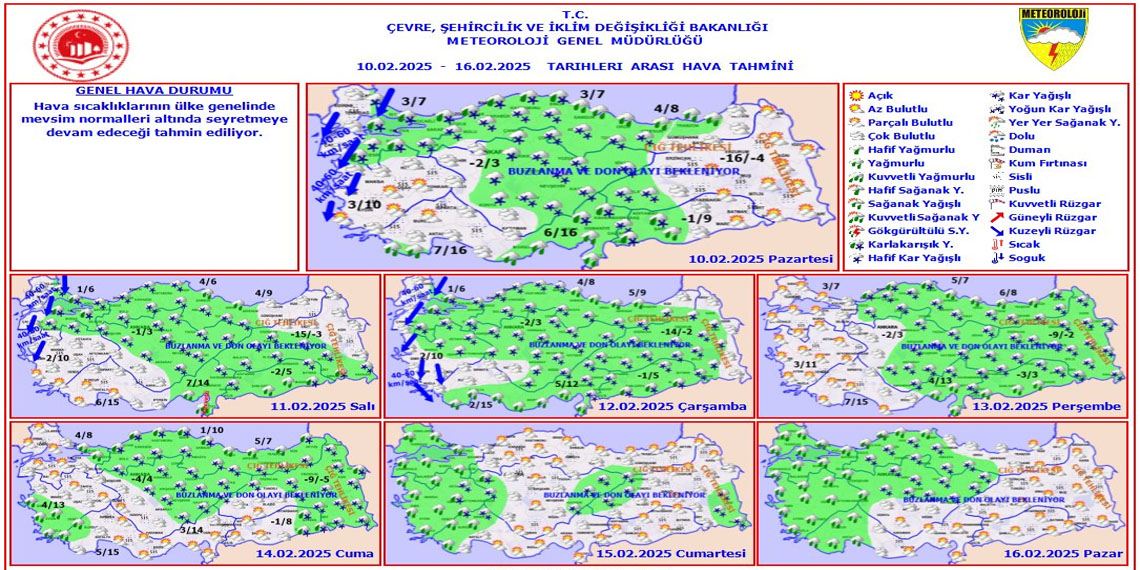 Türkiye’yi etkisi altına alan kar yağışları, bu hafta da sürmeye devam edecek. Meteoroloji Genel Müdürlüğü “Rüzgarın, Marmara ve Kıyı Ege’de kuzeyli yönlerden kuvvetli ve kısa süreli fırtına (40-70 km/sa) şeklinde esmesi beklendiğinden yaşanabilecek olumsuzluklara karşı dikkatli ve tedbirli olunması gerekmektedir” uyarısı yaptı.