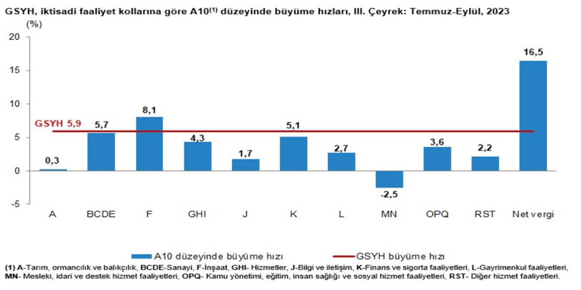 GSYH’yi oluşturan faaliyetler incelendiğinde; 2023 yılı 3’üncü çeyreğinde bir önceki yıla göre zincirlenmiş hacim endeksi olarak, inşaat yüzde 8,1, sanayi yüzde 5,7, finans ve sigorta faaliyetleri yüzde 5,1, hizmetler yüzde 4,3, kamu yönetimi, eğitim, insan sağlığı ve sosyal hizmet faaliyetleri yüzde 3,6, gayrimenkul faaliyetleri yüzde 2,7, diğer hizmet faaliyetleri yüzde 2,2, bilgi ve iletişim faaliyetleri yüzde 1,7 ve tarım sektörü yüzde 0,3 artarken; mesleki, idari ve destek hizmet faaliyetleri yüzde 2,5 azaldı. Ürün üzerindeki vergiler eksi sübvansiyonlar ise yüzde 16,5 arttı.