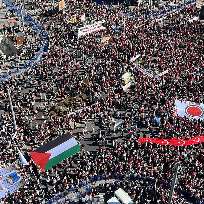 Filistin’in özgürlüğü ve Küresel Sumud Filosu’na destek için ‘Filistin’e Destek Platformu’ öncülüğünde Ayasofya Camii’nde öğle namazı kılan grup, ‘Özgürlüğe Yürüyoruz’ sloganıyla Eminönü meydanına yürüdü. Öte yandan İstanbul Boğazı’nda bir araya gelen Filistin bayraklı tekneler de Eminönü açıklarına doğru hareket etti. Yürüyüşe AK Parti Genel Başkan Yardımcısı Fatma Betül Sayan Kaya, AK Parti İstanbul Milletvekili Hasan Turan, AK Parti İstanbul İl Başkanı Abdullah Özdemir, Esenler Belediye Başkanı Tevfik Göksu, İHH Genel Başkanı Bülent Yıldırım, HAK-İŞ Genel Başkanı Mahmut Arslan ile onbinlerce kişi katıldı.