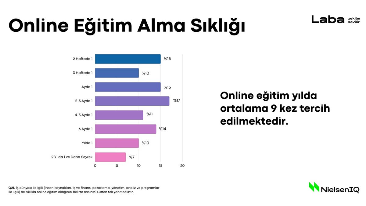 Pandemi dönemiyle yükselen bir trend haline gelen online eğitimler, katılımcıların kariyerlerini ve iş yaşamını desteklemenin yanı sıra çalışma ve iş arama motivasyonlarında da önemli bir yere sahip. Online eğitimler, özellikle aktif çalışma hayatı olan kişilerin en çok tercih ettiği eğitim alma yöntemlerinin başında geliyor. 48 ülkede faaliyet gösteren uluslararası eğitim platformu Laba’nın, NielsenIQ Türkiye araştırma şirketi ile 2022 yılında gerçekleştirdiği Türkiye geneli E-Learning Algı Araştırması’nın sonuçları Ortaköy’de bir kafede Laba CEO’su Yevhen Feldman, Laba Türkiye Ülke Müdürü Elif Tuzlakoğlu, Nielsen Non-FMCG Sektör Lideri Dilek Baylam ve çok sayıda basın mensubunun katıldığı toplantıyla açıklandı.