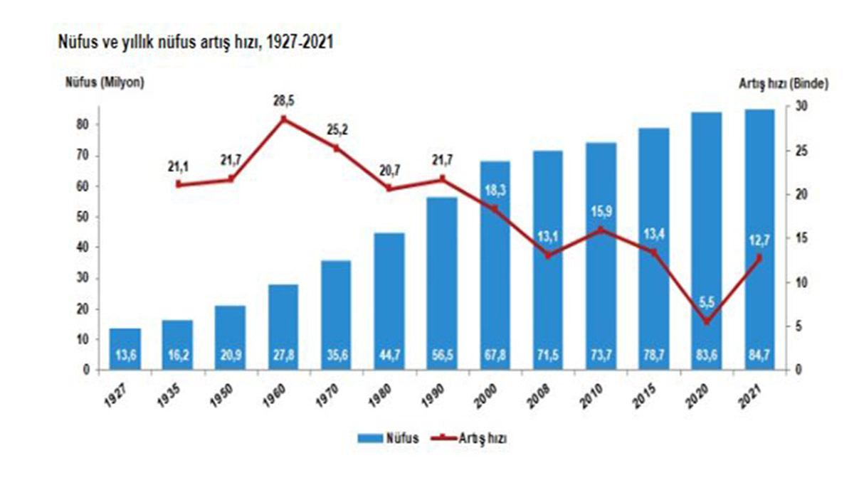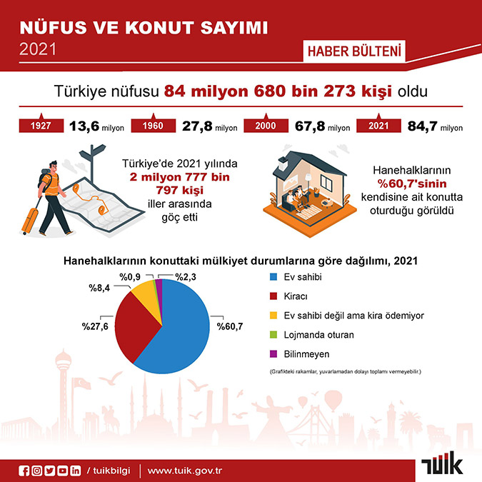 TÜİK, 2021 yılına ilişkin nüfus ve konut sayımı istatistiklerini açıkladı. Buna göre; cumhuriyetin ilk yıllarında yapılan 1927 yılı genel nüfus sayımı sonucuna göre, 13 milyon 648 bin 270 kişi olan Türkiye nüfusu, yıllar içinde sürekli artma eğilimi göstererek 2021 yılında 84 milyon 680 bin 273 kişiye ulaştı.