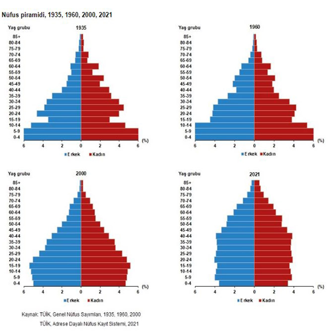 Türkiye’nin 1935, 1960, 2000 ve 2021 yılı nüfus piramitleri incelendiğinde; sağlık alanında kaydedilen gelişmelere, yaşam standardının ve refah düzeyinin artmasına bağlı olarak doğurganlık ve ölümlülük hızlarının azalması ve doğuşta beklenen yaşam süresinin artması ile nüfusun yaş yapısı şekil değiştirdi. Toplam nüfusta yaşlı ve ortanca yaş nüfusun oranı arttı, çocuk ve gençlerin oranı azaldı. 1935 yılında yüzde 21,2 olan ortanca yaş, 2021 yılında yüzde 33,1 oldu. Cinsiyete göre incelendiğinde 1935’te erkeklerde yüzde 19,1 olan ortanca yaş 2021’de yüzde 32,4’e, kadınlarda ise 1935’te yüzde 23,4’ken 2021’de yüzde 33,8’e yükseldi.