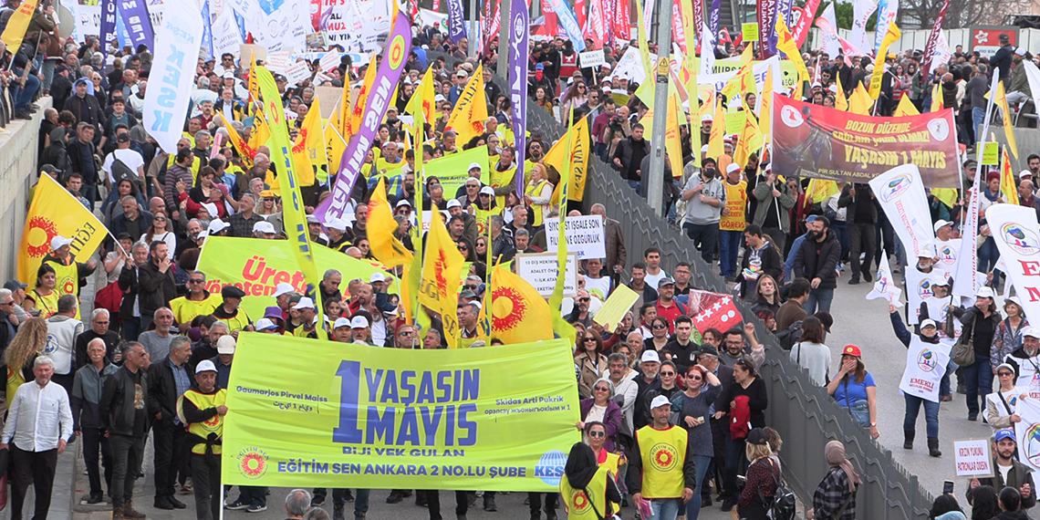 Başkent’te ‘1 Mayıs Emek ve Dayanışma Günü’ etkinlikleri kapsamında, Devrimci İşçi Sendikaları Konfederasyonu (DİSK), Kamu Emekçileri Sendikaları Konfederasyonu (KESK), Türk Mühendis ve Mimar Odaları Birliği (TMMOB) ve Ankara Tabip Odası’ndan oluşan tertip komitesinin öncülüğünde kortej yürüyüşü ve miting düzenlendi. Atatürk Kültür Merkezi metrosunun önünden başlayan yürüyüşe katılanlar, güvenlik kontrolleri kapsamında üst aramasından geçirildi.
