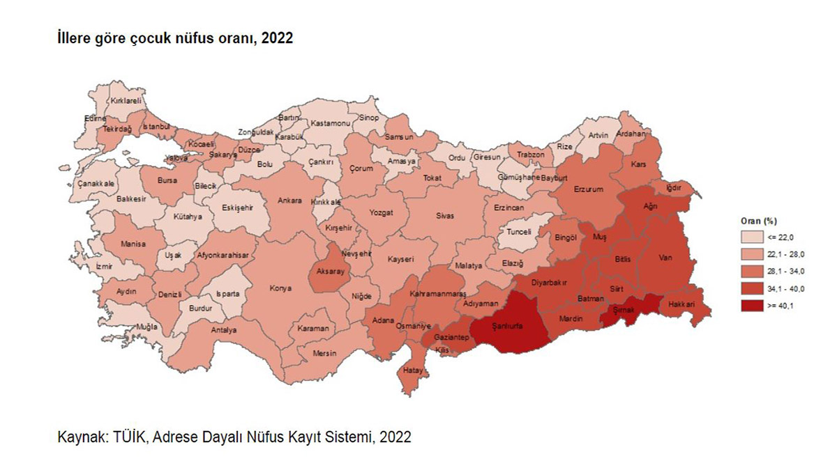 ADNKS sonuçlarına göre illerin toplam nüfusları içindeki çocuk nüfus oranları incelendiğinde, 2022 yılında en yüksek çocuk nüfus oranına sahip olan il, yüzde 44,9 ile Şanlıurfa oldu. Şanlıurfa ilini yüzde 41,4 ile Şırnak ve yüzde 39,3 ile Ağrı izledi. Çocuk nüfus oranının en düşük olduğu il, yüzde 16,9 ile Tunceli oldu. Tunceli ilini yüzde 17,7 ile Edirne ve yüzde 18,4 ile Kırklareli izledi.