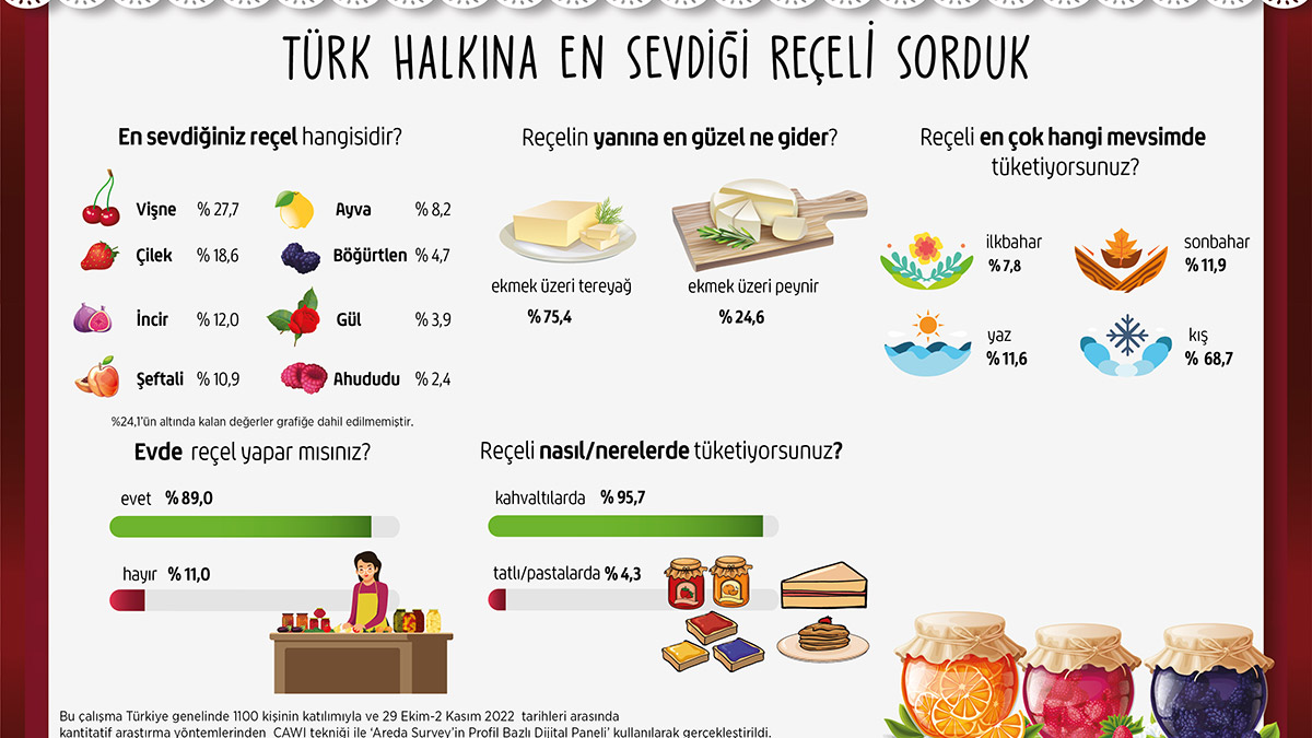 Areda Survey’in reçel araştırmasına göre Türk halkının yüzde 68,7’si reçeli kışın tüketiyor ve yüzde 27,7’si vişne reçelini seviyor. Bir diğer öne çıkan husus ise kış aylarının sevilen besin kaynağı reçeli Türk halkının yüzde 89’u satın almak yerine evde yapmayı tercih ediyor.